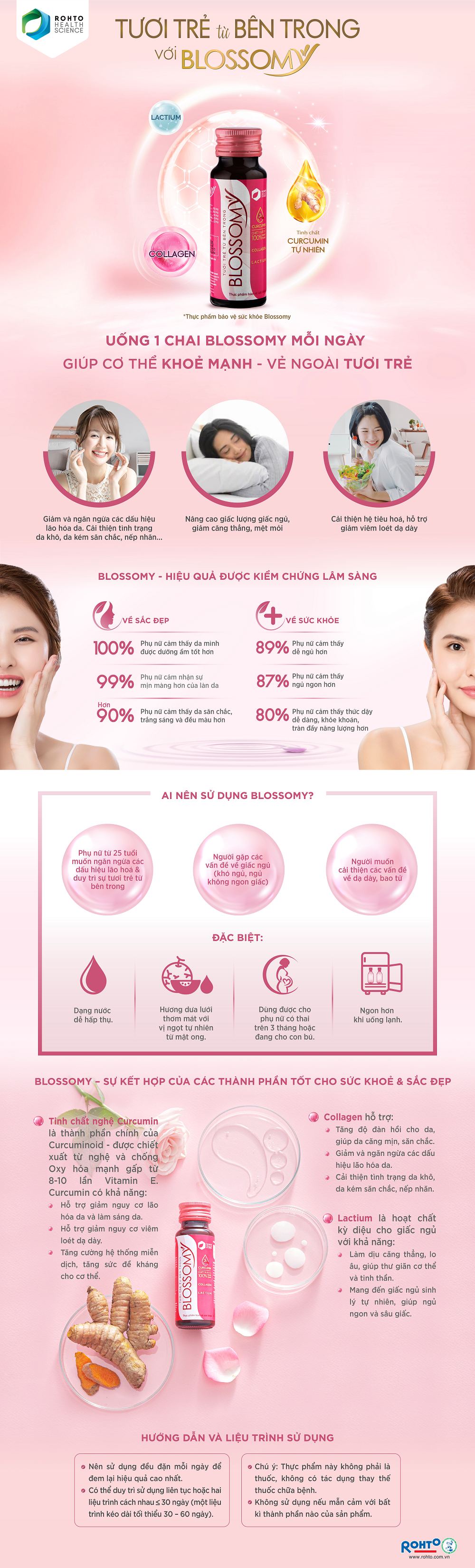 Blossomy là thực phẩm bảo vệ sức khỏe, phối hợp Curcumin tự nhiên từ nghệ vàng với Collagen với hàm lượng 50ml/ chai cùng các chất Lactium, Vitamin B1, Vitamin B6 và Mật Ong hình thành nên công thức giúp da sáng đẹp, căng mịn, trẻ trung và làm lành giảm viêm loét dạ dày. Hàm lượng Curcumin có mặt trong Blossomy đạt trên 90% tinh khiết về hàm lượng, không pha trộn, đảm bảo chất lượng. Sản phẩm dạng nước có hương vị dưa lưới thơm mát cùng vị ngọt tự nhiên từ mật ong, dễ sử dụng hằng ngày và giúp cơ thể hấp thu dưỡng chất tối đa