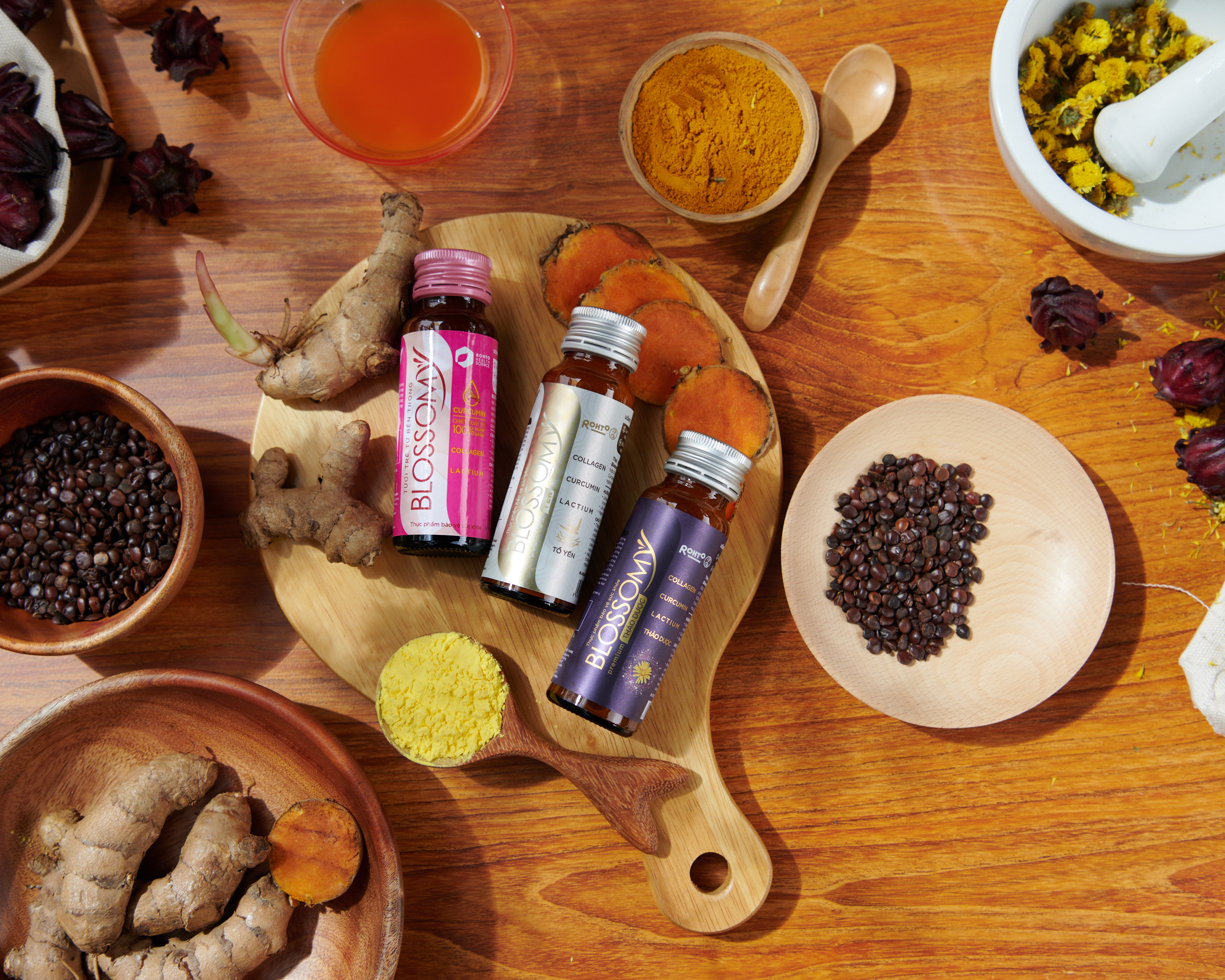 - Nghệ dùng trong Blossomy là giống nghệ vàng được tuyển chọn đặc biệt & thu hoạch vào giai đoạn ngủ đông để lấy được tối đa dinh dưỡng trong củ nghệ.