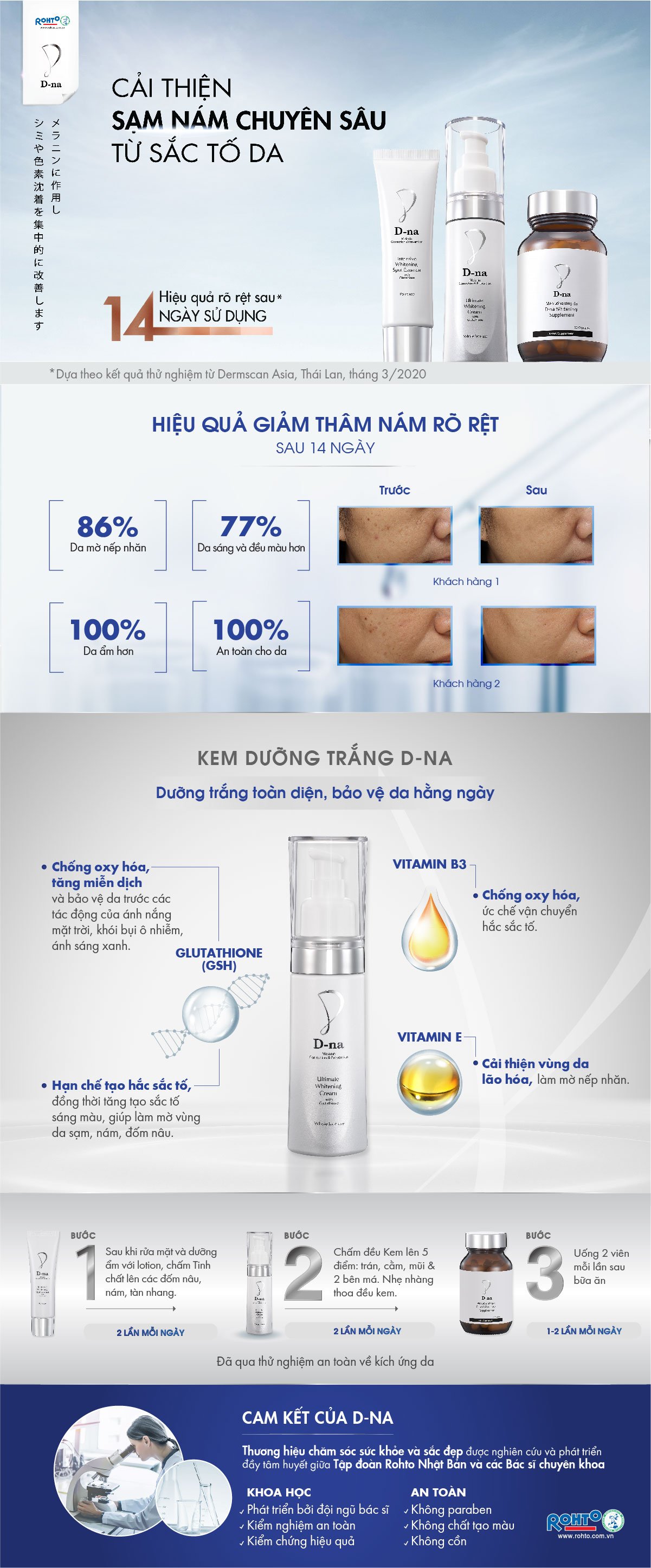 Kem dưỡng trắng toàn diện D-NA Ultimate Whitening Cream giúp sáng đều màu da chỉ trong 14 ngày sử dụng với các thành phần quý nhập khẩu từ Nhật Bản & Pháp: