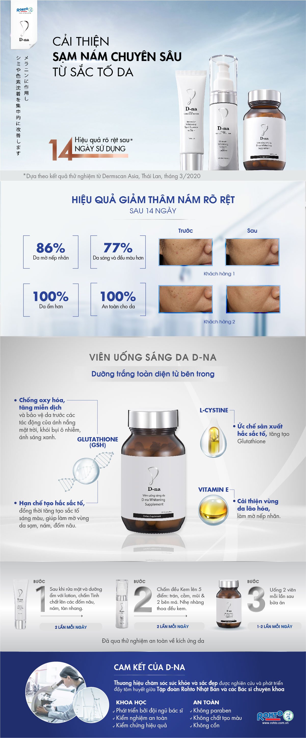 Viên uống sáng da D-NA giúp dưỡng da toàn cơ thể được trắng khỏe toàn diện từ bên trong với các thành phần quý nhập khẩu từ Nhật Bản & Pháp: