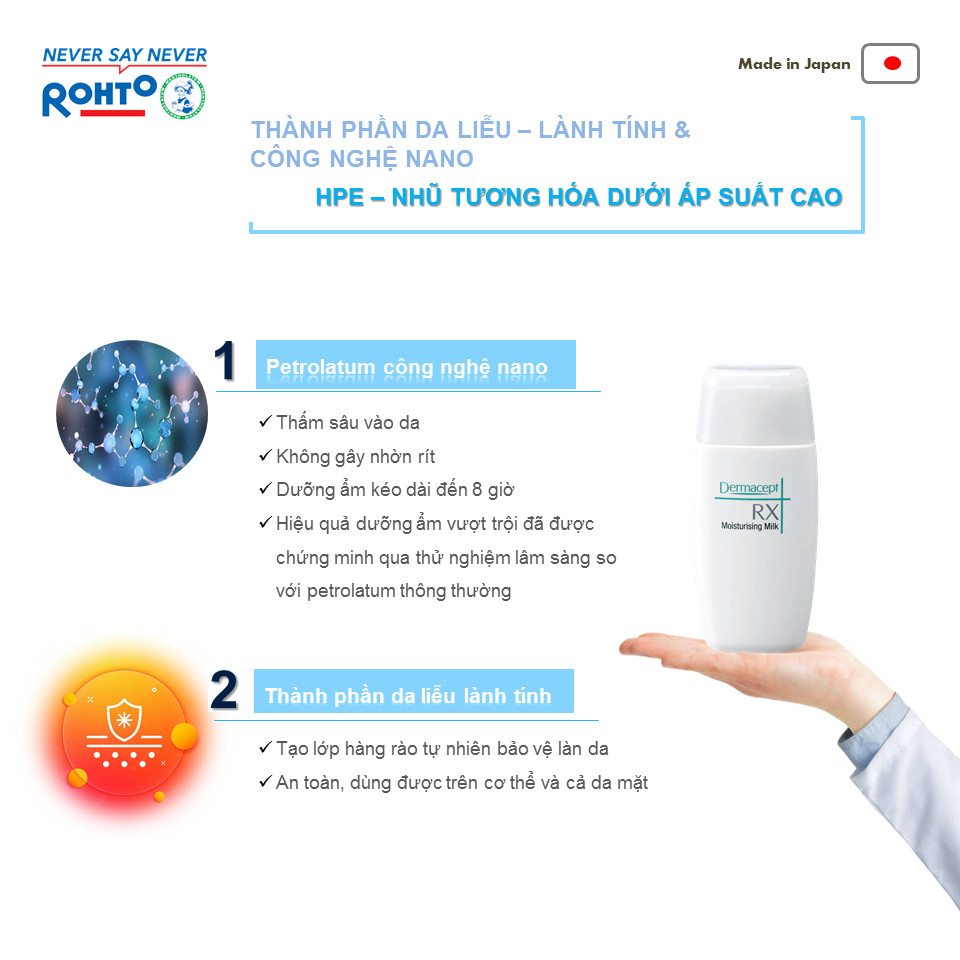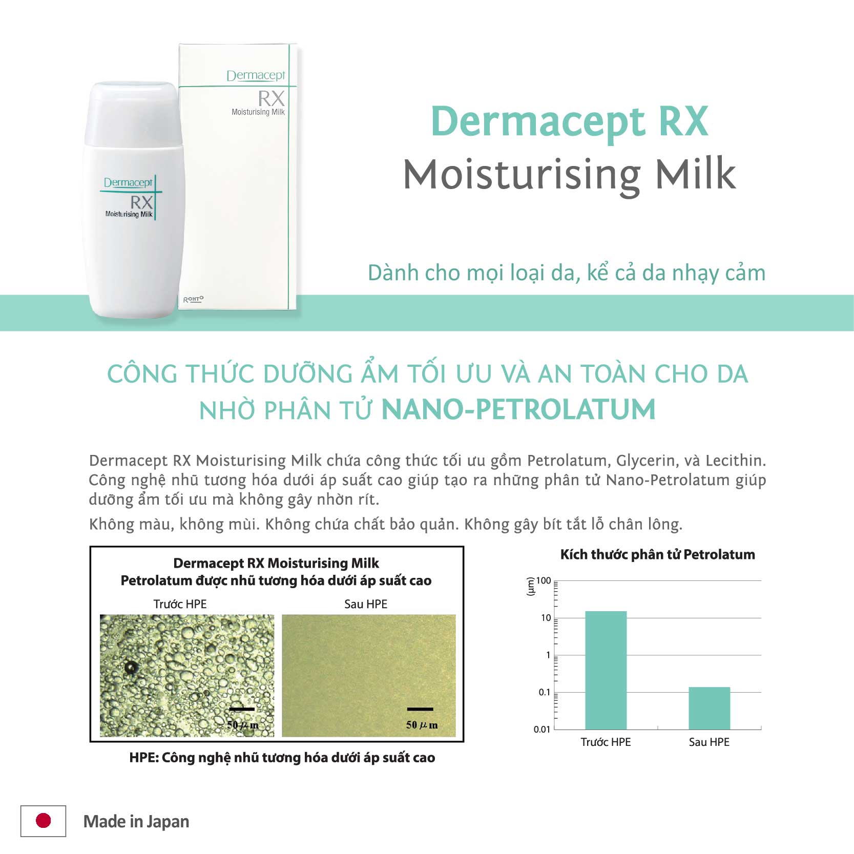 - Dermacept RX Moisturising Milk không gây nhờn rít và khả năng dưỡng ẩm kéo dài đến 8 giờ nhờ thành phần Petrolatum công nghệ nano, Glycerin và Hydrogenated Lecithin dễ dàng thấm sâu vào da