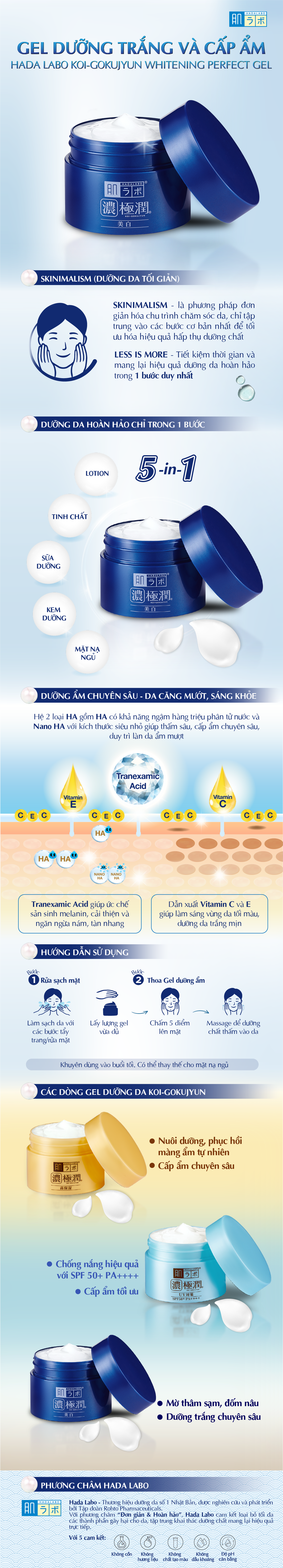 Gel dưỡng trắng Hada Labo Koi-Gokujyun Whitening Perfect Gel dưỡng trắng hiệu quả với Tranexamic Acid – hoạt chất dưỡng trắng mạnh mẽ giúp mờ thâm nám từ gốc và kháng viêm cao, giúp mờ thâm sạm, giảm đốm nâu, dưỡng ẩm sâu mỗi ngày.