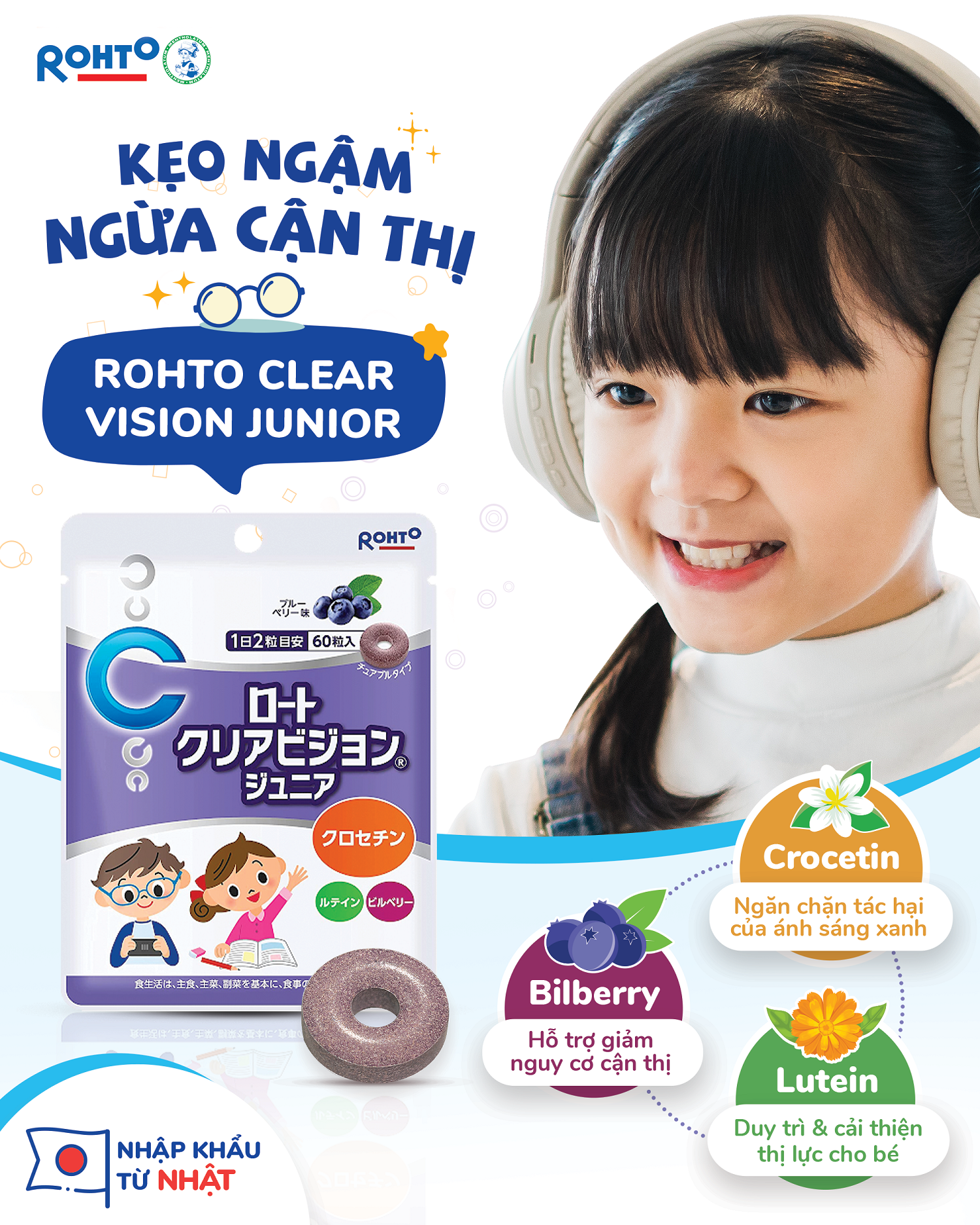 - Kẹo ngậm Rohto Clear Vision Junior với hàm lượng cao Crocetin 2,5g từ cây dành dành, Lutein từ cúc vạn thọ, Bilberry từ việt quất đen, giúp bổ sung dinh dưỡng cho mắt, bảo vệ tế bào võng mạc, hỗ trợ duy trì thị lực và giảm nguy cơ cận thị.