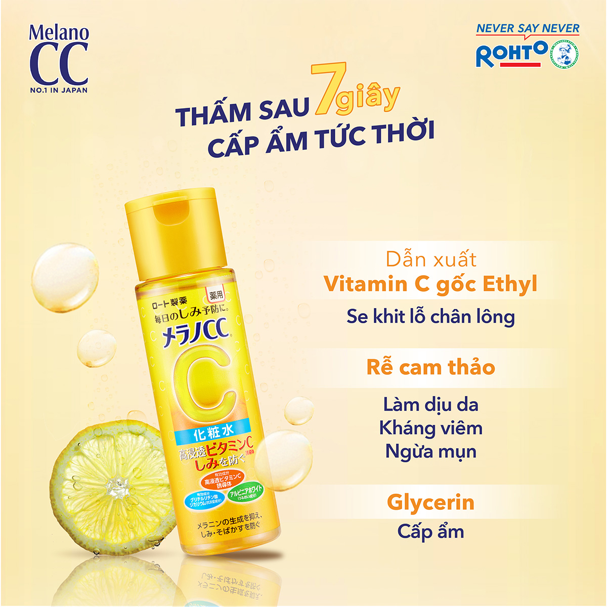 Dung dịch Melano CC Lotion 170ml là bước đầu trong quy trình dưỡng da trắng sáng khỏe mịn với tác dụng làm dịu da, cấp ẩm tức thời & hỗ trợ se khít lỗ chân lông. Đặc tính thấm nhanh chỉ sau 7s, cùng với dưỡng chất cam thảo và Vitamin C dịu nhẹ, đây sẽ là bước đầu quan trọng để làm mướt và sáng bề mặt da, đồng thời cung cấp độ ẩm cần thiết cho các bước dưỡng ngay tiếp sau.