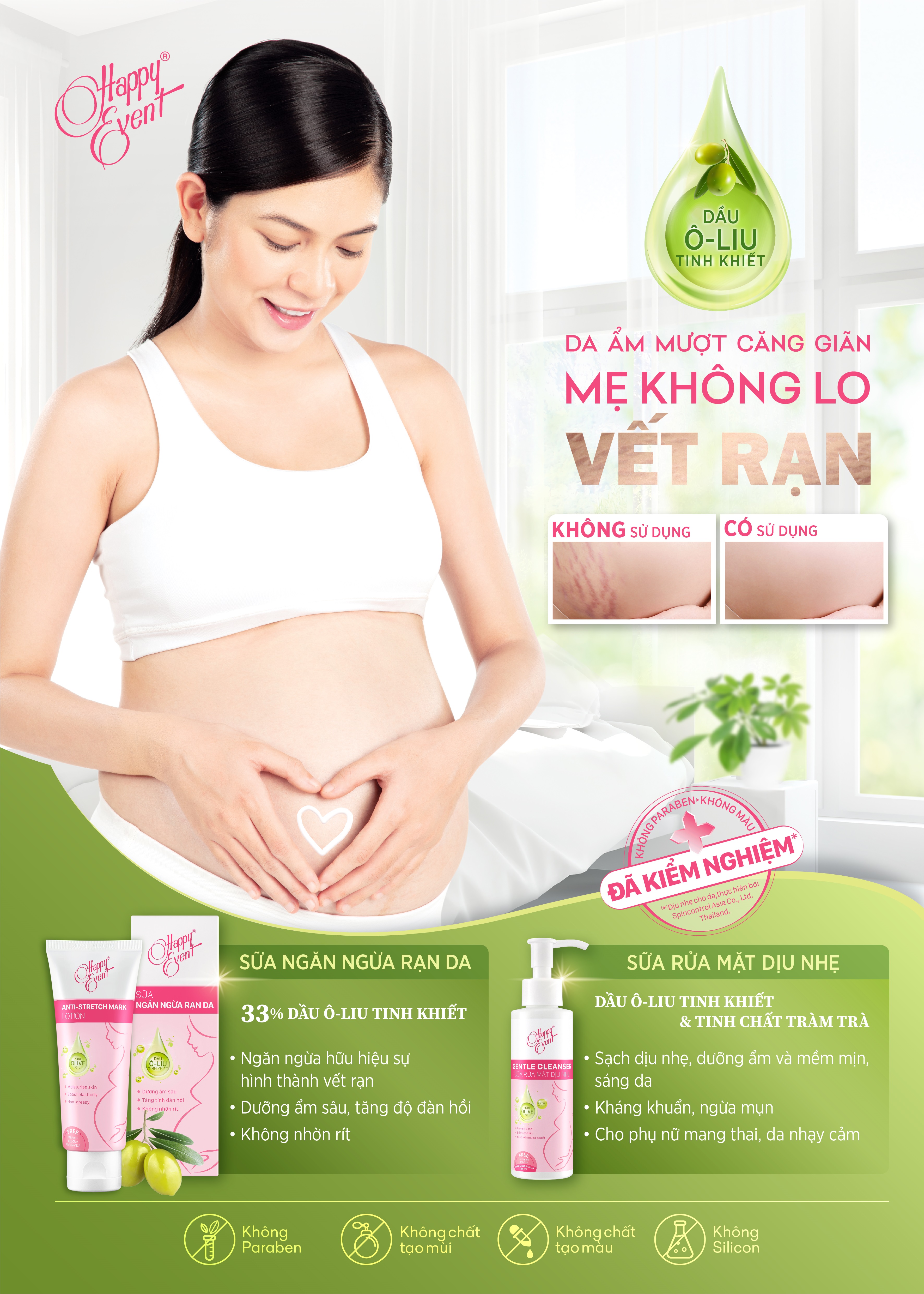 - Sữa chống rạn da Happy Event với 33% tinh dầu Ô-liu nguyên chất giúp dưỡng ẩm tự nhiên, tăng tính đàn hồi cho mô liên kết ngăn ngừa hữu hiệu sự hình thành vết rạn và duy trì trạng thái săn chắc vốn có của làn da.